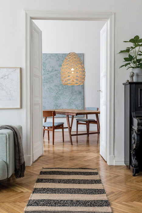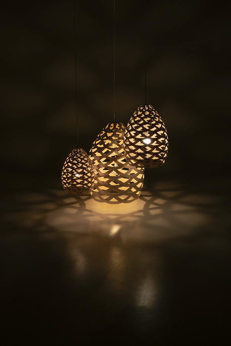 Tūī are the real characters of Aotearoa’s native bush. They hurtle through the bush with drumming wing-beats, miraculously avoiding branches whilst maintaining their cool charm. Their song is like no other: a series of clicks, gurgles and resonant, bell-like notes...some off our hearing scale! They have two dangling white wattles on their throats and around their shoulders is a necklace of interwoven rings which is the inspiration of our Tūī light. Half rings of bamboo are woven into a basket form that would sit perfectly over a dining table, kitchen counter or equally hanging in a stairwell or entrance void.