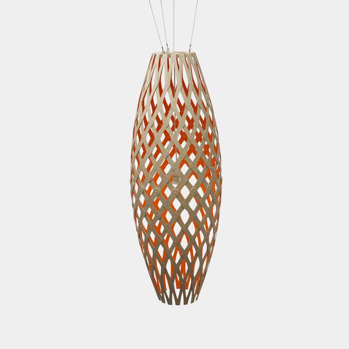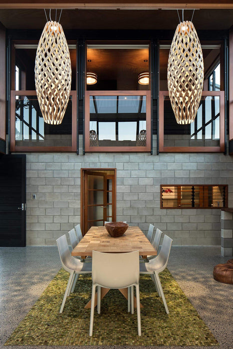 Hīnaki was David’s first exploration into lighting in 1995 when he made a prototype based on fish traps which are called hīnaki by Maori. Hīnaki traps were made from woven vines, some in amazingly beautiful forms.